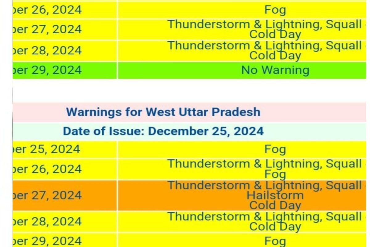 The Meteorological Department has predicted hailstorms along with rains on December 26, 27, 28 in some places of Agra, Meerut, Bulandshahr, Gautam Buddha Nagar, Ghaziabad, Hapur district, Baghpat district, Saharanpur district, Muzaffarnagar, Shamli, Moradabad district of western UP. Talking about the temperature, the minimum temperature on Tuesday was recorded at 7 degrees Celsius while the maximum temperature was 25 degrees Celsius. The temperature is likely to fall by 2 to 3 degrees Celsius in the next 48 hours.