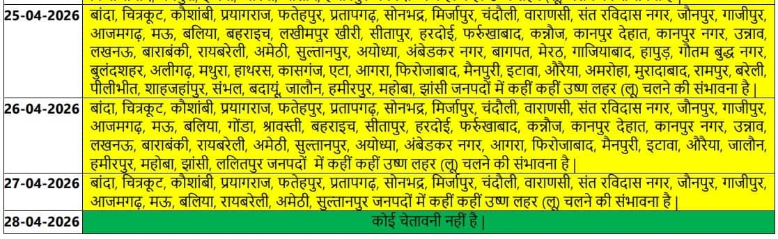 April 25 (60 Districts): A heatwave alert has been issued for nearly the entire state, including districts such as Lucknow, Kanpur, Prayagraj, Varanasi, Agra, Meerut, Ghaziabad, Noida, Ayodhya, Jhansi, Bareilly, Lakhimpur Kheri, Hardoi, Firozabad, and Mainpuri.